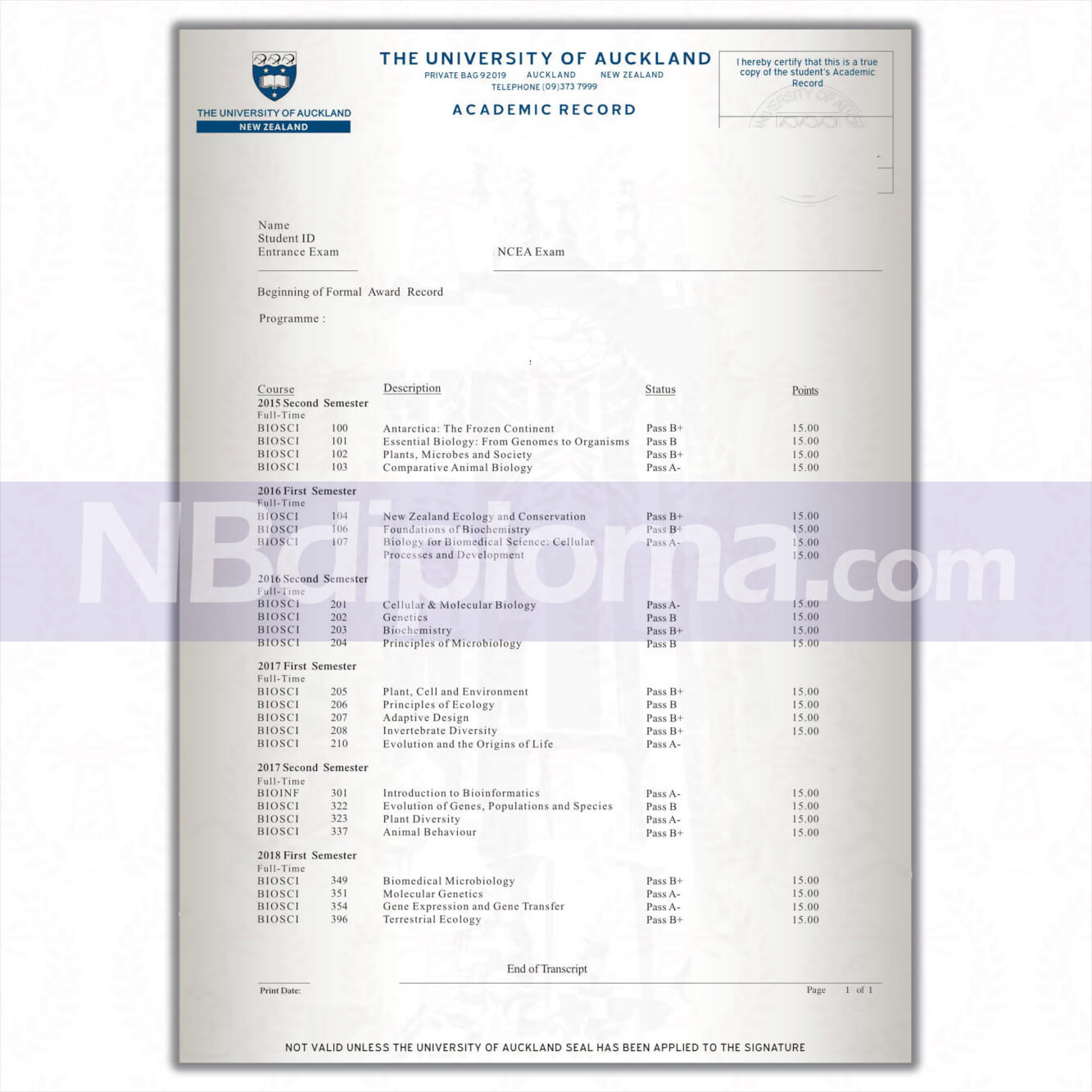 奥克兰大学成绩单样本,成绩单为我们专业老师排版的课程,所有课程均符合正常毕业证书专业信息.GPA等.您也可以提供您的相关课程资料定制奥克兰大学成绩单
